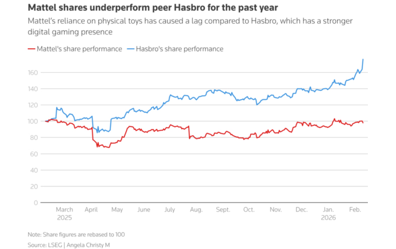 Η Mattel και η Hasbro παρουσίασαν απογοητευτικές προβλέψεις για το 2026, αλλά η αντίδραση των αγορών ήταν αντίθετη: οι μετοχές της Hasbro ενισχύθηκαν έως 9% λόγω της επιτυχίας της στον χώρο των ψηφιακών παιχνιδιών, ενώ η Mattel κατέγραψε πτώση 27%, σε πορεία για τη χειρότερη ημερήσια πτώση της σε περισσότερα από 20 χρόνια.